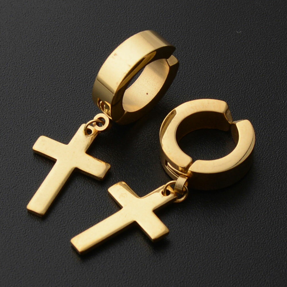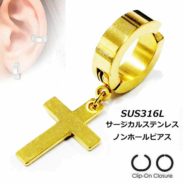 [ イヤーカフ ステンレス ] ゴールドクロス ステンレスイヤリング 1個販売 金色 十字架 フェイクリング メンズ レディース プレゼント サージカルステンレス316L 挟む はさむ コスプレ フープピアス風 リングピアス風 ノンホールピアス ノンホールイヤリング あけない