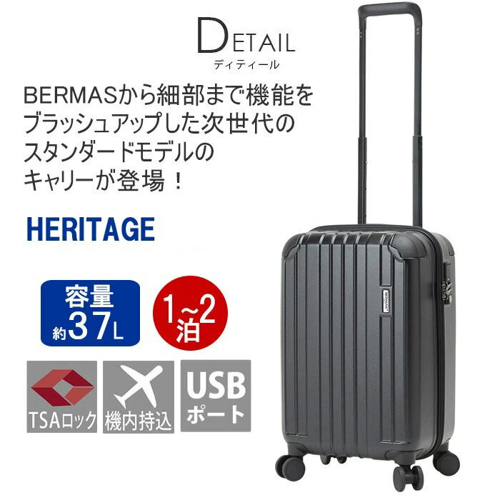 ■メーカー品番:60490 ■カラー:ブラック、シルバー、ワイン、ネイビー ■サイズ:本体/W33×H48×D25(cm)、全体/W35×H54×D25(cm)※メーカー参照 ■素材:PC+ ■重量:約2.7kg(付属物含まず) ■容量:約37L ■付属品:ミニポーチ・鍵2本・アルファベットシール ■特徴:TSAロック装備・USBポート(2口付き)・HINOMOTO製ストッパー付き静音キャスター(SILENT RUN)・伸縮ハンドル3段階調節(地面からの高さ約102cm/96cm/90cm)細部まで機能をブラッシュアップした次世代のスタンダードモデル。