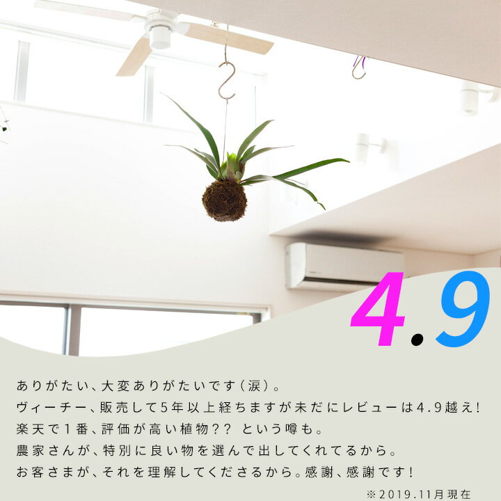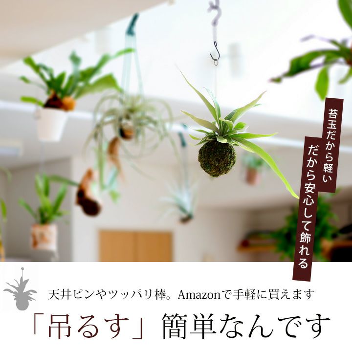 (1) 全体高さ:40cm前後※吊り具の部分を含む (2) 苔玉の直径:8〜9cm程 関連商品・バリエーション ■■あると便利!S字フックコチラから ■■取扱いのコウモリランはコチラから ■■「吊り下げ」シリーズはコチラから 育て方(説明書付き) 【水やりについて】 (置き場所によって異なりますが)おおよそ2週間に1度、洗面器に水をはり、苔玉を浸けます。